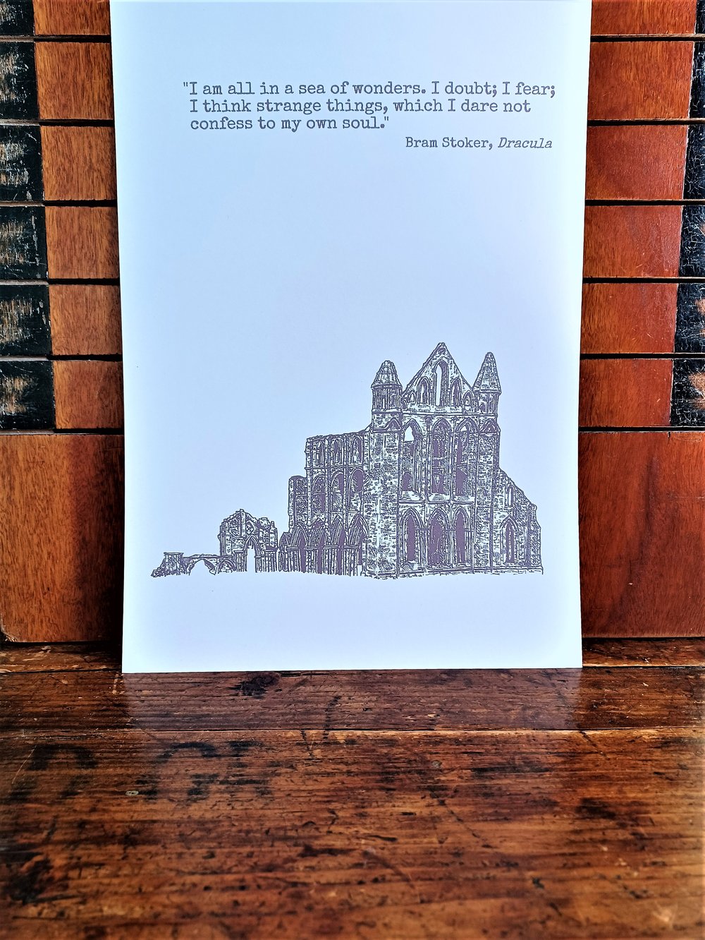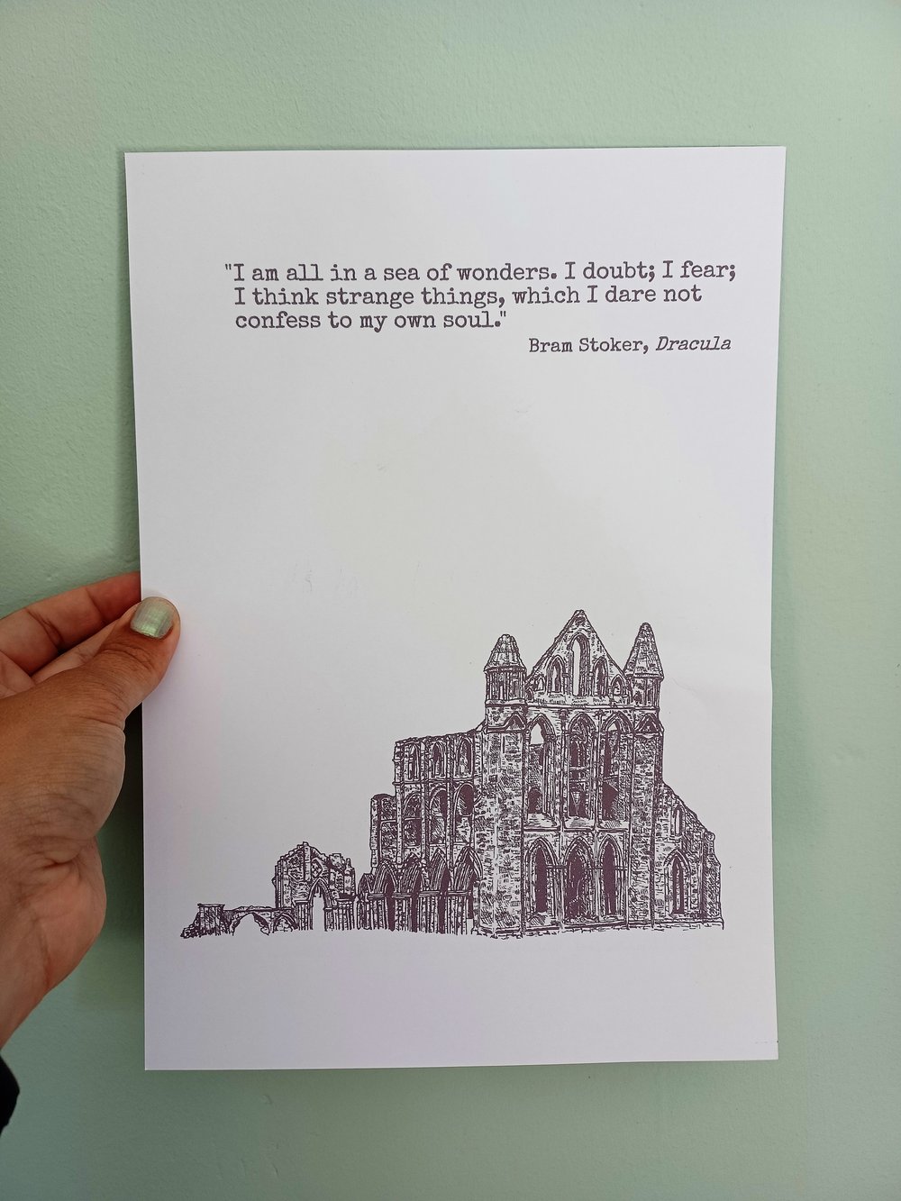 This poster features an iconic Jonathan Harker quote from Bram Stoker's "Dracula" and a hand-drawn illustration of Whitby Abbey. A perfect gift for fans of the book or anyone who loves literature!